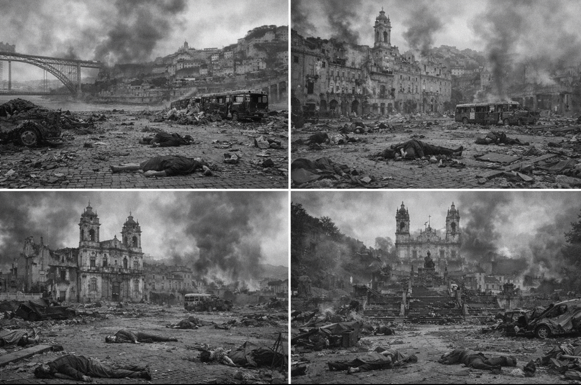Não tarda, bombardeiros e caças, outros aviões mais, de transporte, reconhecimento e logística, sobrevoam os mesmos céus que hoje olhamos todos, estrondeiam cruzando os ares e trazendo a morte libertadora na barriga de cada ave metálica. O céu escurece e chove fogo, caem as bombas e incendeiam-se as cidades, primeiro Lisboa, depois o Porto e Coimbra e Braga, arde ainda Évora e Viana do Castelo e Lamego, “missão cumprida”, diz um gringo pelo rádio da aeronave, sorrindo, é que do alto não se ouvem os gritos desesperados das mães segurando os filhos mortos nos braços, os choros órfãos das crianças nos colos das mães assassinadas, não se ouvem os gemidos moribundos dos homens trucidados que acudiam aos campos, ouvem-se uns esparsos vivas em Beja e Leiria e Bragança, que Salazar é morto. Descontando o ditador, morrem treze mil novecentas e cinquenta duas pessoas, mais de mil e seiscentas são crianças.